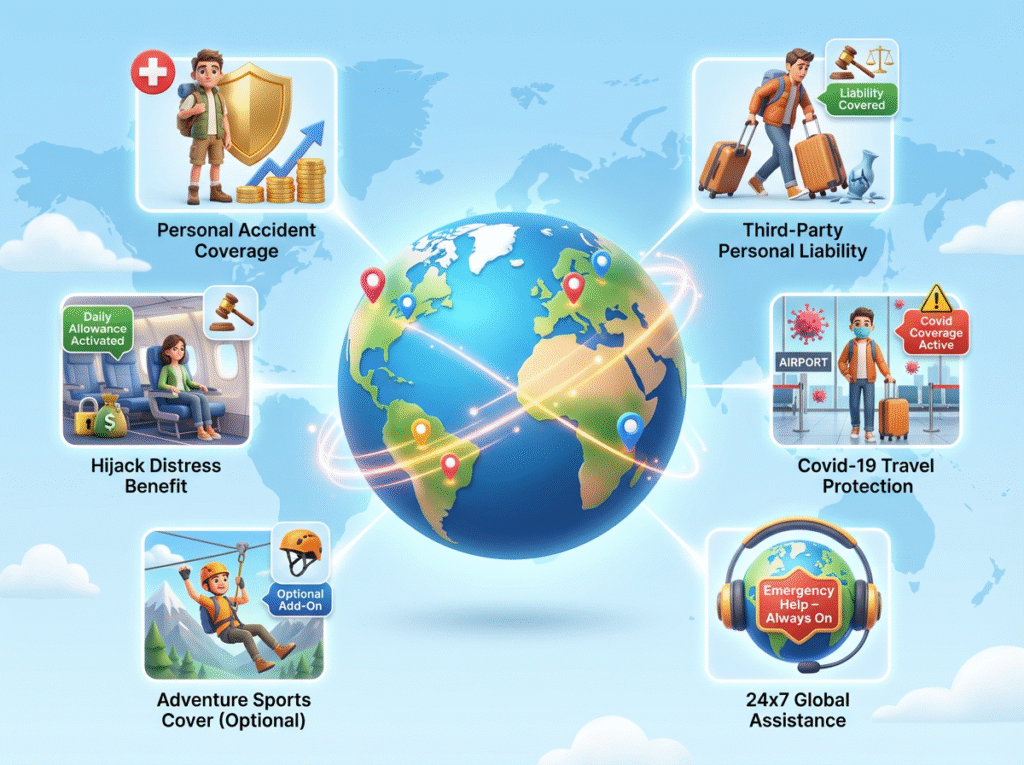 Coverage During Trave Provides a lump-sum payout in case of accidental death or permanent disability while travelling.ย