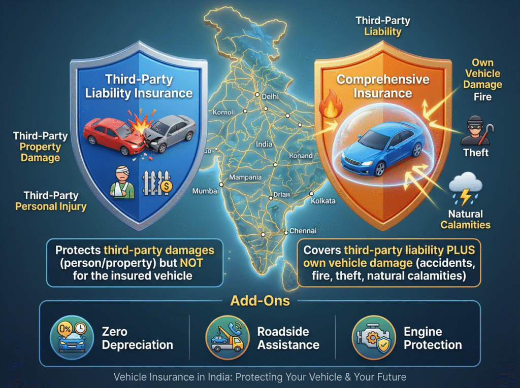 Vehicle insurance in India is a type of general insurance that provides financial protection to vehicle owners against losses or damages arising from accidents, theft, natural disasters, or third-party liabilities. It is mandatory under the Motor Vehicles Act, 1988 for all vehicles operating on Indian roads.