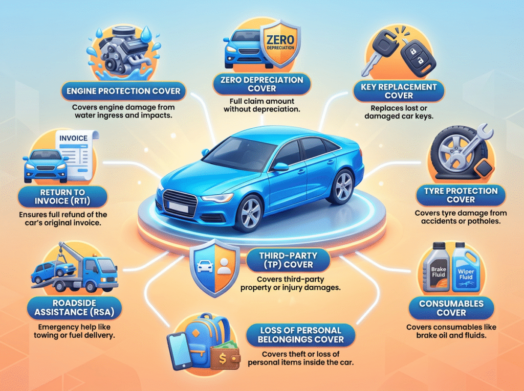 • Zero depreciation cover • Roadside assistance • Engine protection • Return to invoice • NCB (No Claim Bonus) protection